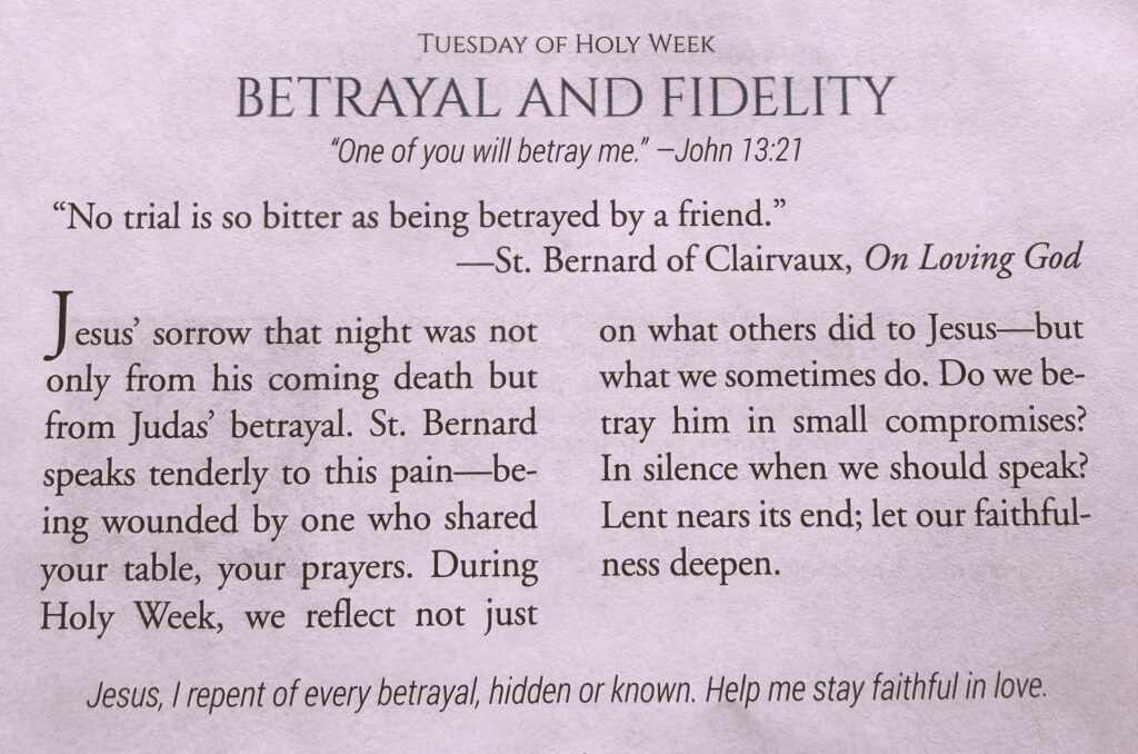”Jesus, forgive my every betrayal, hidden or known, and help me stay faithful in love. Amen.”