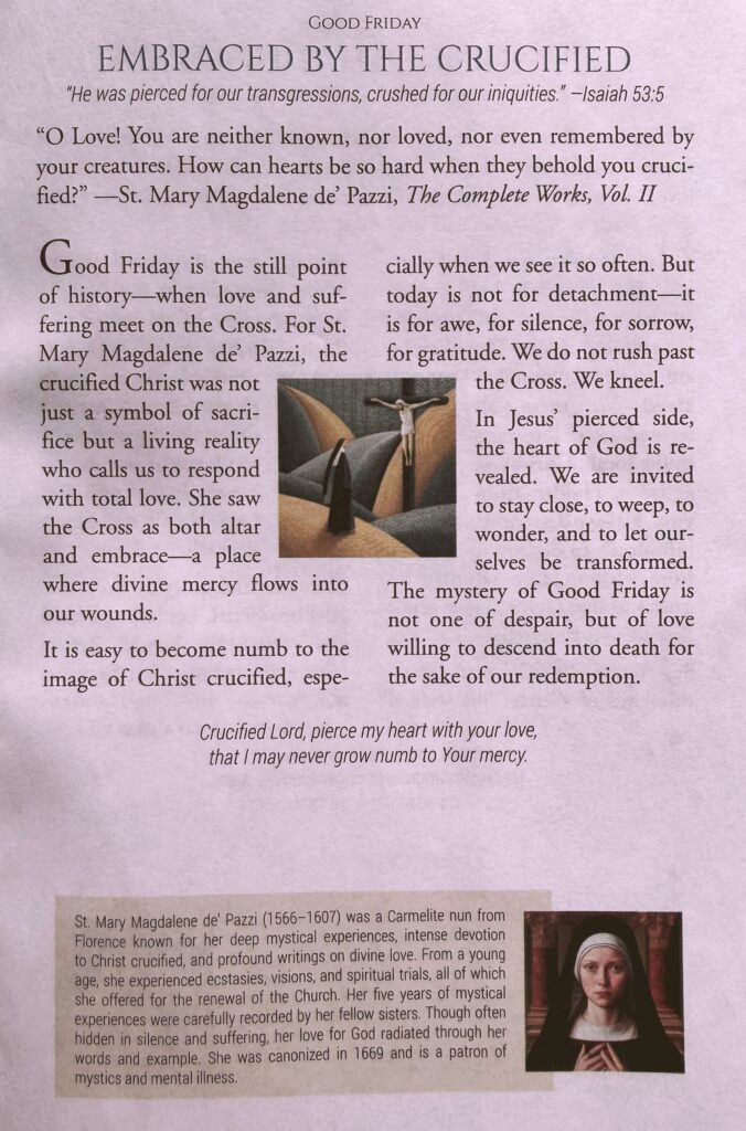The passage today says “the mystery of Good Friday is not one of despair, but of love willing to descend into death for the sake of our redemption”.